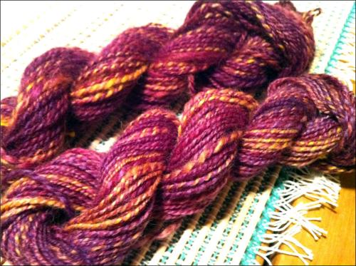 In said spinning class, I also happened to learn about the technique of fractal spinning. I decided to give it a try, and spun up a bit of colored roving. The roving didn’t split quite evenly, so the colors don’t match up perfectly, but I’m pleased with the effect. This is also the first finished (albeit tiny) skein that I’ve produced off of the Delft spindle.