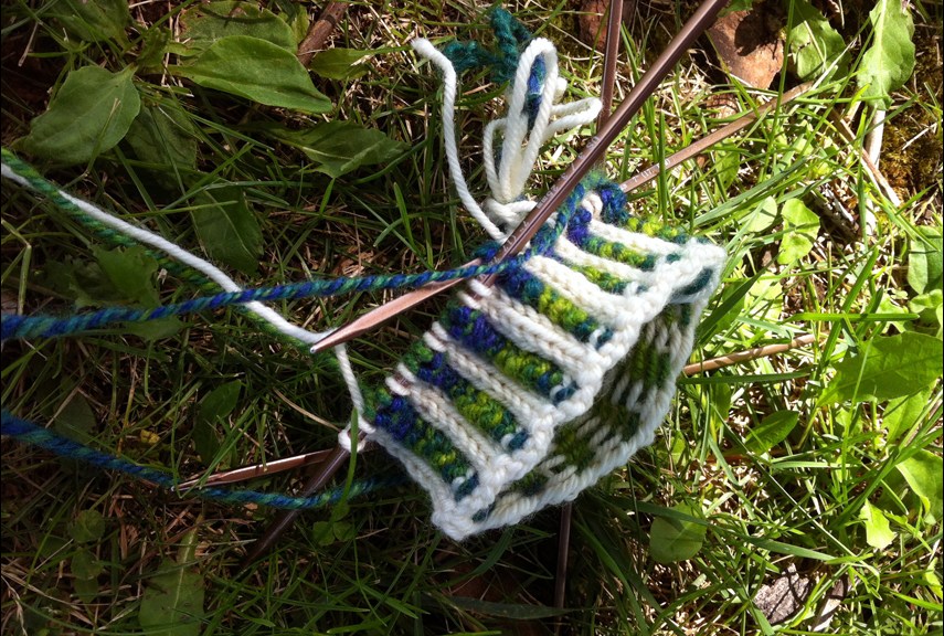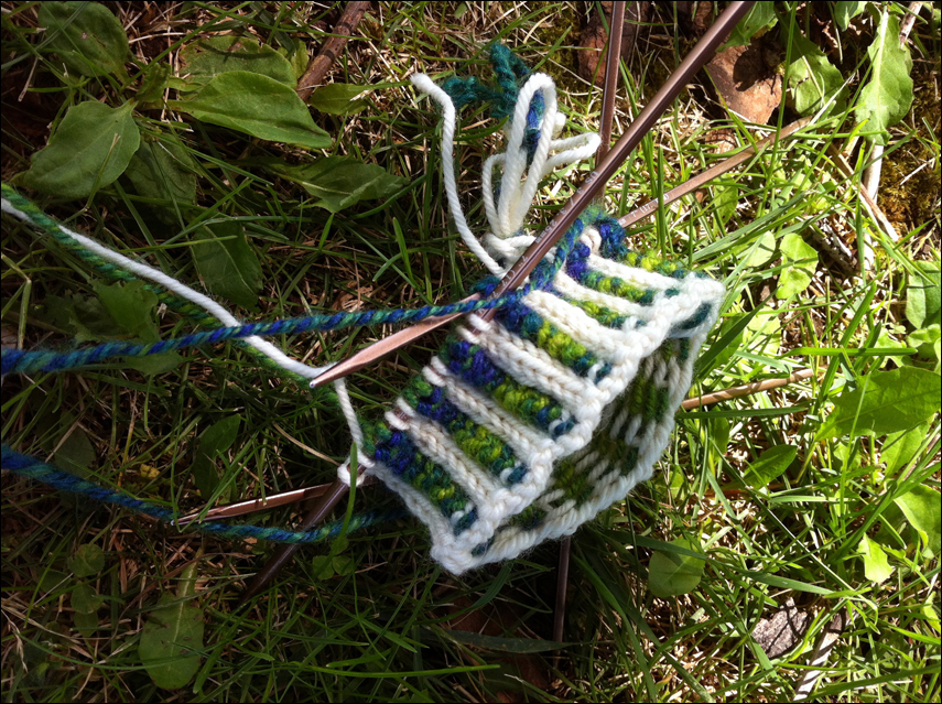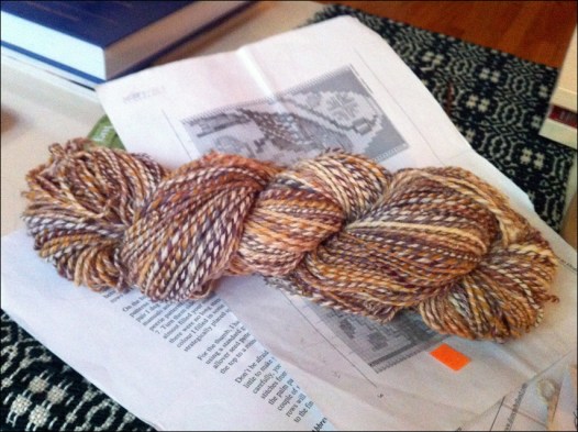 My half-handspun Nightingale adaptation is now progressing nicely. I think the design is more succesful with this combination of yarns, at least on an aesthetic level, but I’m not sure the mittens will fit my monstrously large hands. I’m holding out hope for a bit of blocking magic.